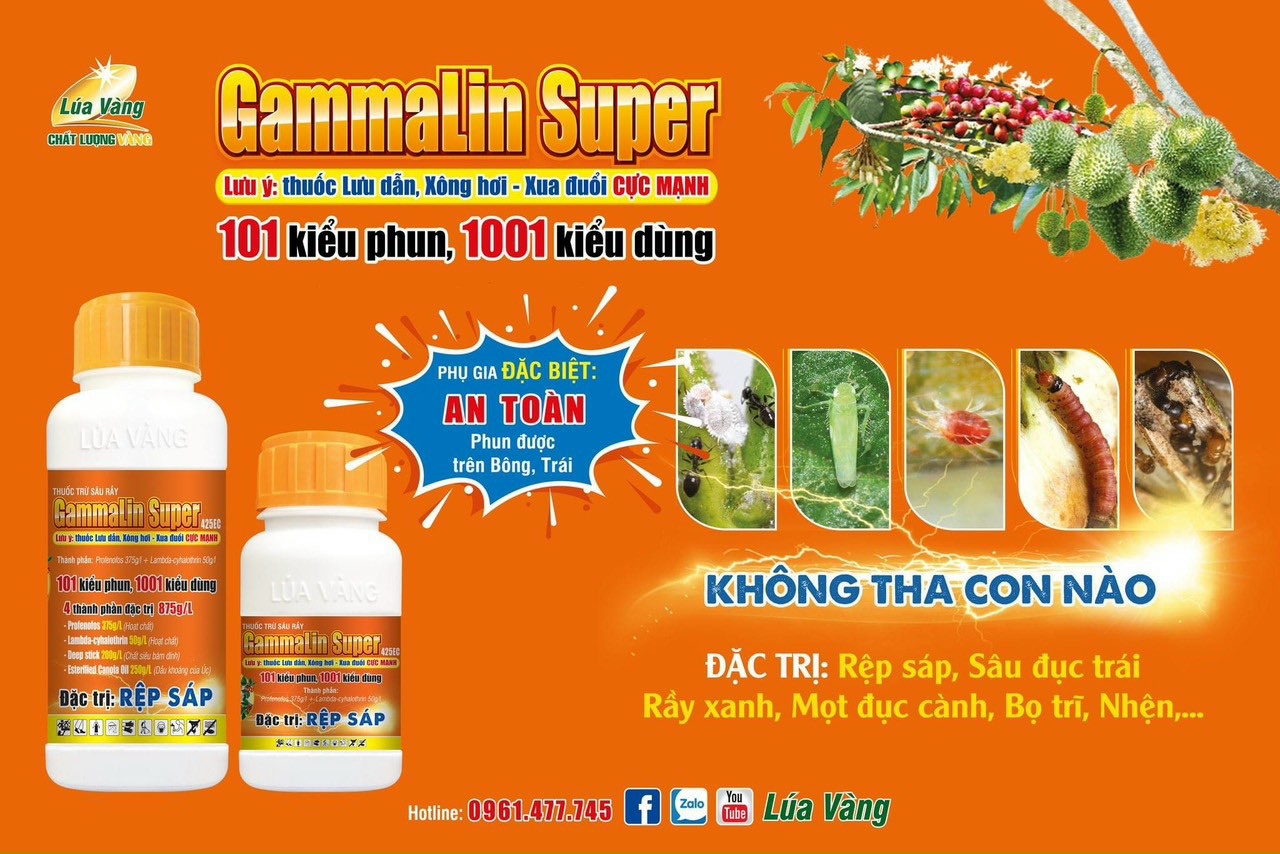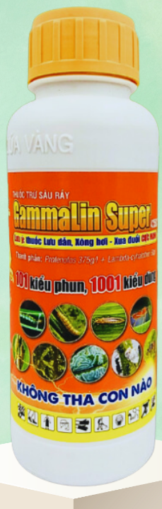 GAMMALIN SUPER 425 EC – thuốc trừ sâu rầy thế hệ mới chuyên diệt sạch nhiều loại sâu hại như bọ trĩ, muỗi hành, nhện gié, sâu phao, rầy nâu, sâu cuốn lá, sâu cắn chẽn, cùng các loại côn trùng gây hại trên cây trồng như sâu vẽ bùa, sâu đục trái, rầy mềm, rệp sáp, rệp vảy, mọt đục cành trên nhiều loại cây như lúa, rau màu, cây có múi, cà phê, sầu riêng, xoài và nhiều cây ăn quả khác